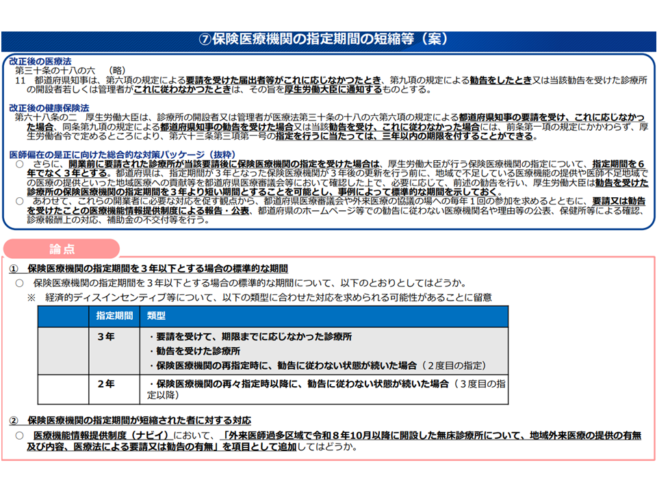 ・「要請を受けて期限までに応じなかった」「勧告を受けた」「保険医療機関の再指定時に勧告に従わない状態が続いた(2度目の指定)」場合には3年とする