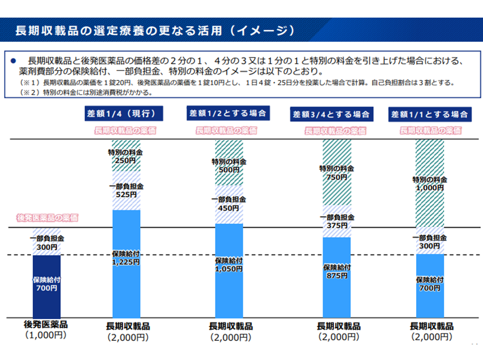 今後、この患者特別負担を、例えば「長期収載品(先発品)と後発品との差額の2分の1以上」とする方向で検討を進めてはどうか―。