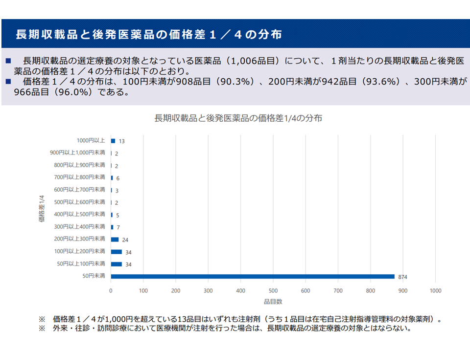 ▽「長期収載品の選定療養の対象」となっている医薬品(1006品目)の1剤当たりの「長期収載品と後発品との価格差の4分の1」の分布を見ると、100円未満が90.3%(908品目)、200円未満が93.6%(942品目)、300円未満が96.0%(966品目)であり、「1000円以上」は13品目である(いずれも注射剤だが、うち1品目は在宅自己注射指導管理料の対象薬剤)