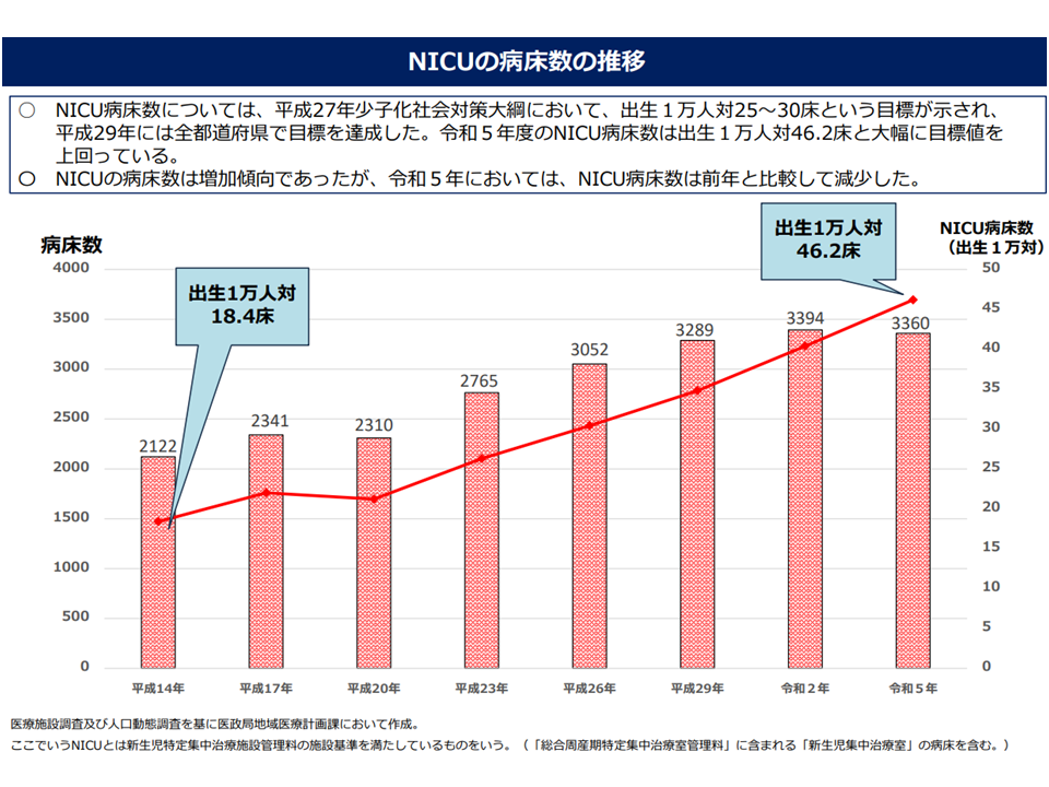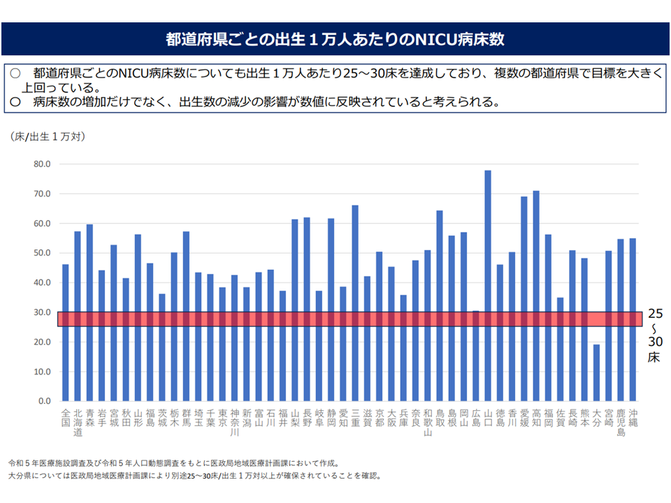 ▽NICU病床数は、2015年の少子化社会対策大綱において「出生1万人対25-30床」との目標が示され、現在、この目標を大国超える数のNICU病床数が整備されている