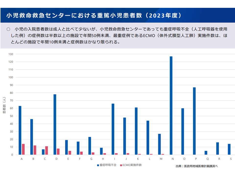 ▽小児救命救急センターでも、重症呼吸不全(人工呼吸器使用例)の症例数は「半数以上の施設で年間50例未満」、最重症例であるECMO(体外式膜型人工肺)実施件数は「ほ とんどの施設で年間10例未満」と症例数はかなり限られる