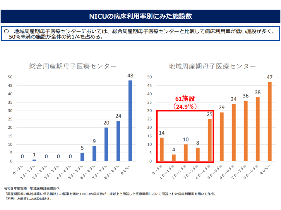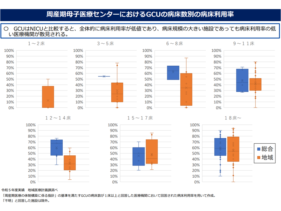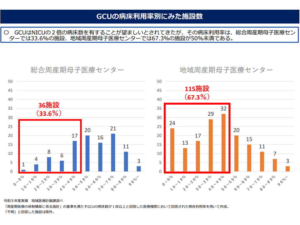 NICU・GCUの利用率が低い基幹的な施設(周産期母子医療センター)も少なくなく、「地域周産期母子医療センターの在り方」や「NICUとGCUのバランス基準」(NICUの2倍のGCUを地域で整備する)などの見直しを検討すべきではないか―。