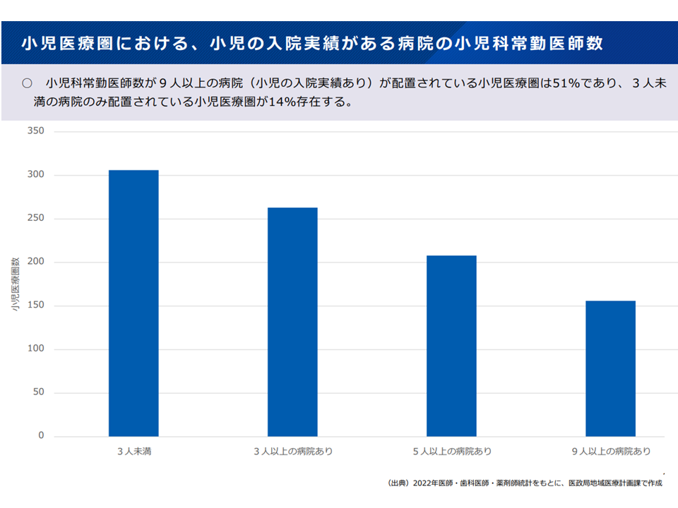 ▽小児科常勤医師数が9人以上の病院(小児の入院実績あり)が配置されている小児医療圏は51%あるが、3人未満の病院しか配置されていない小児医療圏も14%存在する