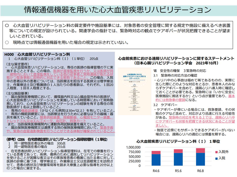 ・オンライン診療の原則である「有効性、必要性、安全性」を最優先に検討すべき。本来、心大血管リハビリは病院においても一定面積以上の機能訓練室・酸素供給措置、除細動器などの機器設置・緊急の手術・検査体制などが求められる「リハビリの中でもとりわけ安全性への配慮」が求められるものである。医師による在宅での実施についても点数や基準すらいまだに設けられていない。それを飛び越えて、一気にオンラインでの実施を認めることは時期尚早であろう。因果関係は否定されているが有害事象が多い点が気になる。病院では迅速対応が可能だが、オンラインではタイムラグが生じ、危険である。まずは「在宅で心大血管リハビリを実施する際の基準」などを学会の見解、各種臨床データをもとに検討していくべき(診療側の江澤委員)