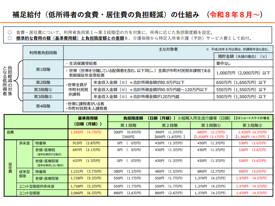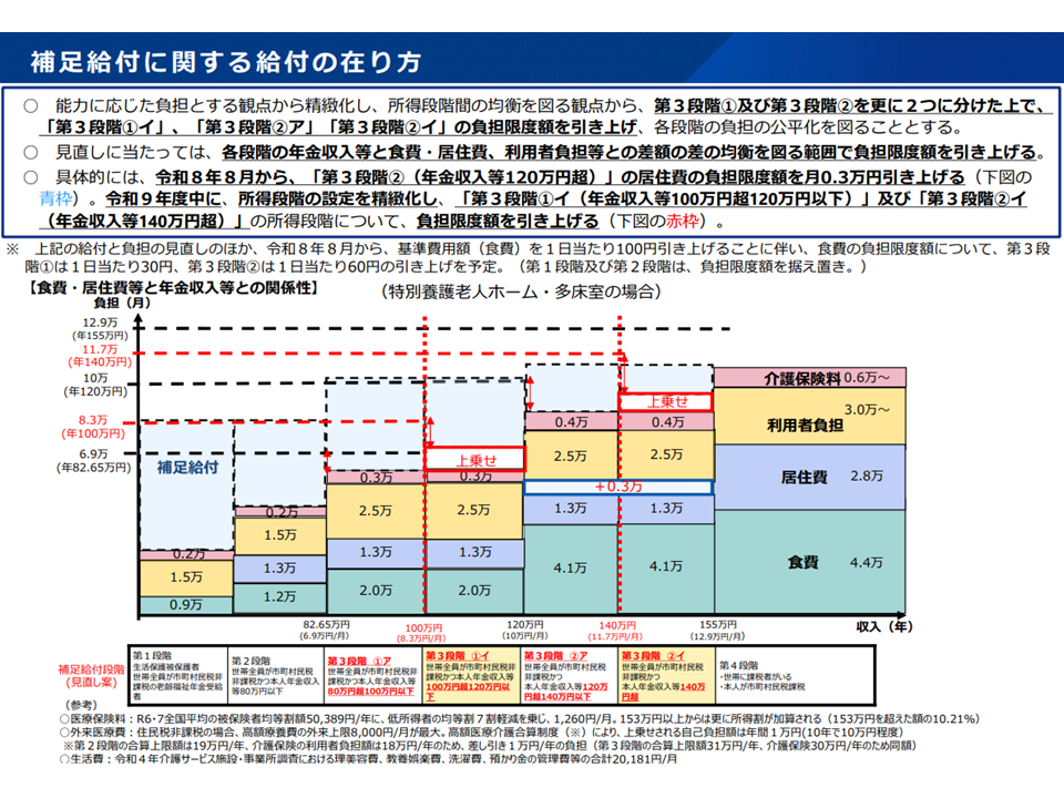 ▼2026年8月から「年金収入等120万円超の所得区分の居住費の負担限度額を月3000円引き上げる