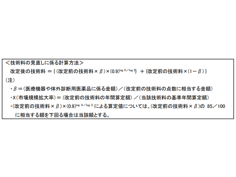 ▽技術料の見直しを行う場合の算定方法について、特定保険医療材料の市場拡大再算定の再算定式に準じて以下のとおり設定する