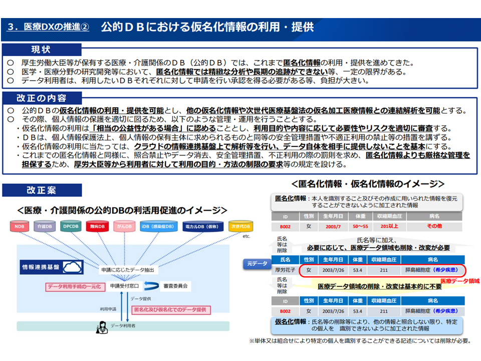 ▼厚生労働大臣等が保有する医療・介護関係のデータベース(難病データベース・小児慢性特定疾患データベースも含まれる)について、これまで匿名化情報の利用・提供に加え、より利活用しやすい「仮名化情報」の利用・提供を可能とし、他の仮名化情報や次世代医療基盤法の仮名加工医療情報との連結解析を可能とする(公布(2025年12月12日)後3年以内の政令で定める日に施行)