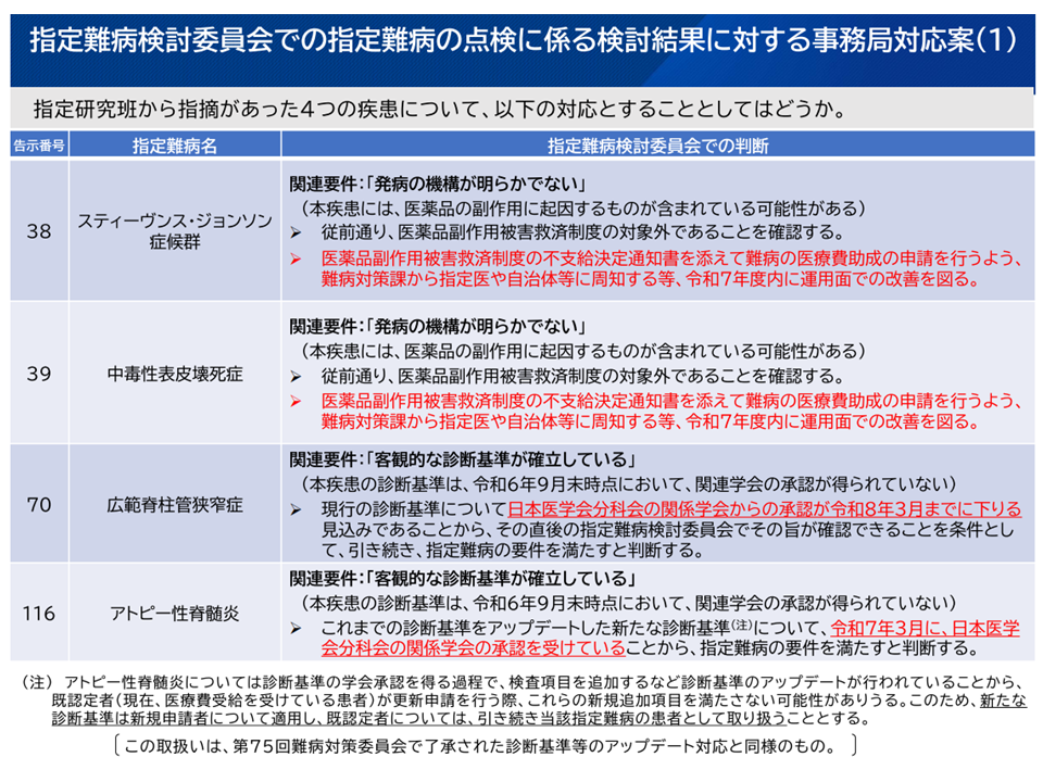 ▼医薬品副作用被害救済制度で救済されるケース(薬剤等による2次性のもの)は「指定難病の対象外」であるとの従前どおりの取り扱いを確認するとともに、同救済制度の「不支給決定通知書」を添えて指定難病の医療費助成申請を行うことを求める(本年度(2025年度)中に運用改善を図る)