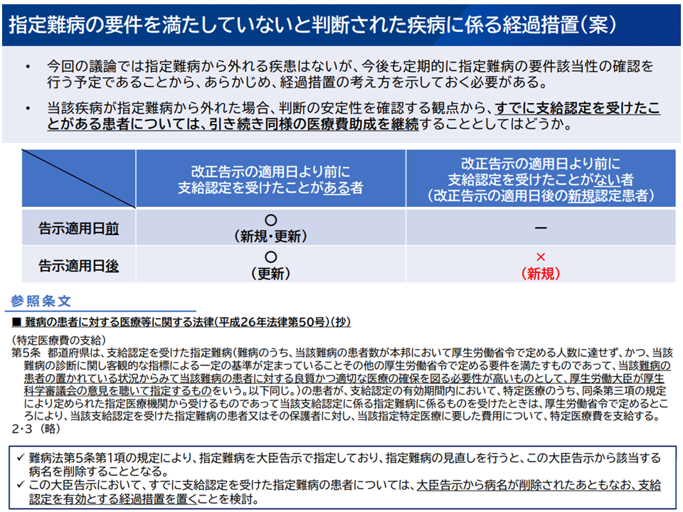 また、上記のように今回の見直しでは「指定難病の対象から外れる疾患」は出ませんでしたが、今後は「指定難病の対象でなくなる疾患」が現れることも想定されます。そうした事態に備え、厚労省は次のような「経過措置」案を提示しています。