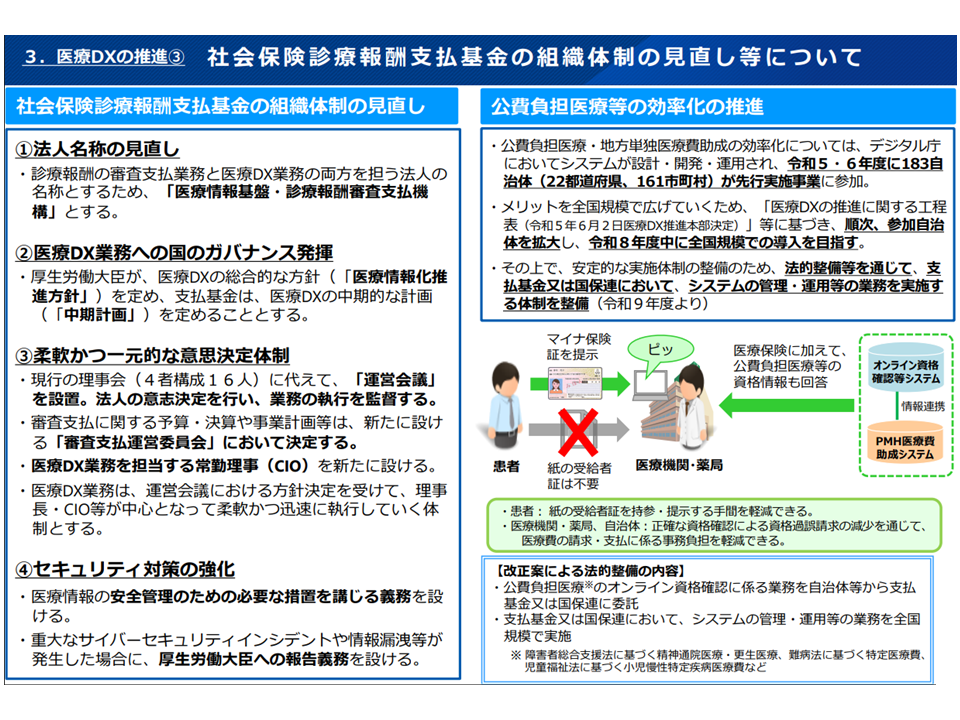 →その上で、安定的な実施体制の整備のため今般の法的整備(改正医療法)等を通じて、支払基金・国保連においてシステムの管理・運用等の業務を実施する体制を整備する(2027年度より)