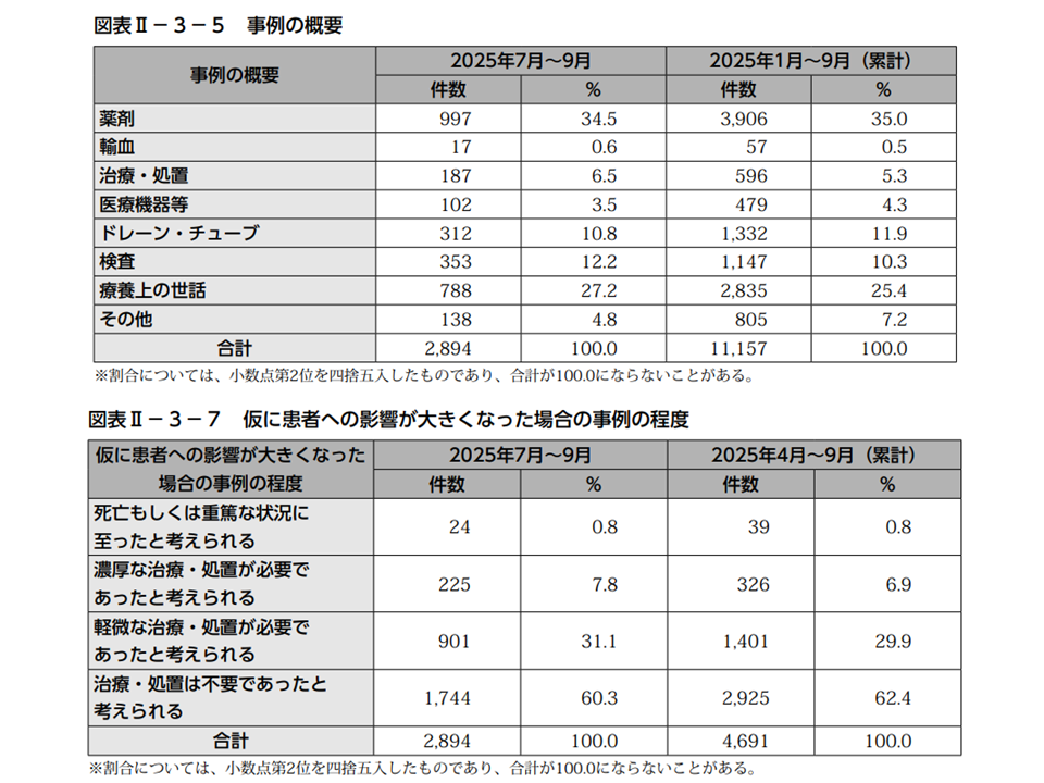 ヒヤリ・ハット事例(事故には至らなかったものの、ヒヤリとした、ハッとした事例)に目を移すと、昨年(2025年)7-9月の報告件数は2894件。内訳を見ると、依然として「薬剤」関連の事例が最も多く997件・ヒヤリ・ハット事例全体の34.5%(前四半期と比べて5.0ポイント減)を占めています。次いで「療養上の世話」788件・同27.2%(同4.5ポイント増)、「ドレーン・チューブ」312件・同10.8%(同0.8ポイント減)などと続いています。