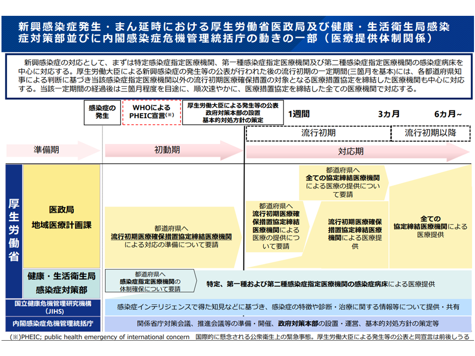 ▽新興感染症が発生した場合には、▼まず特定感染症指定医療機関・第一種感染症指定医療機関・第二種感染症指定医療機関が中心に対応する▼次いで、流行が確認された場合には「流行初期に対応する」特別協定を締結した医療機関が対応し(3か月程度を想定、減収分の補填が行われる)▼補助金や診療報酬臨時特例が整ってきた段階で、「入院医療を担当する」などの協定を結んだ医療機関等が対応する—という段階的対応をとる—