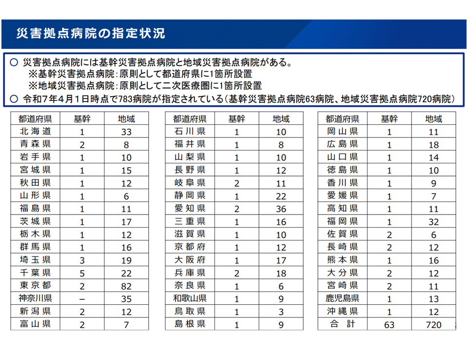 このうち(1)の災害拠点病院については、▼耐震整備▼非常用自家発電設備(3日分程度の備蓄燃料等確保)▼給水設備(3日分程度の水確保)▼備蓄倉庫(3日分程度の食料等確保)▼救命医療のための診療設備等(24時間緊急対応し、災害発生時に被災地内の傷病者等の受け入れ・搬出を行う体制等)▼災害医療派遣チーム(DMAT)派遣体制▼浸水対策—といった要件が定められ、昨年(2025年)4月1日時点で全国に783病院が指定されています。