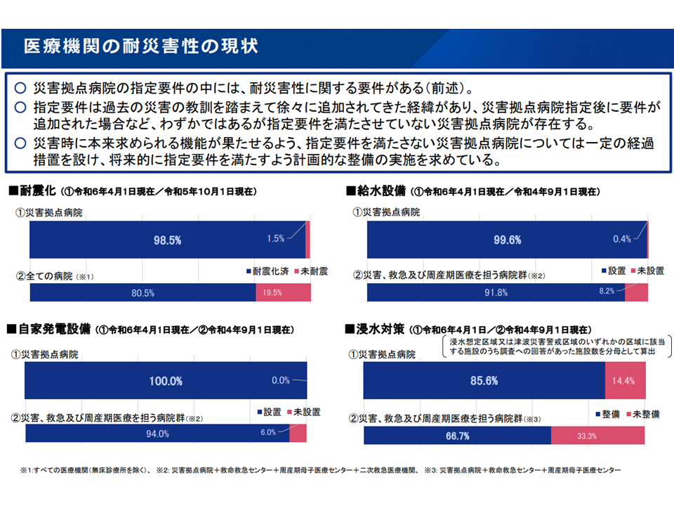 また、災害拠点病院「以外」の病院についても、BCP(事業継続計画)の策定、耐震化、浸水対策、ならびに各種インフラ障害に備えた設備整備が期待されているものの、▼災害拠点病院では取り組みが進んでいる▼拠点病院「以外」の病院では、まだ十分な取り組みが進んでいない―ことが分かっています。