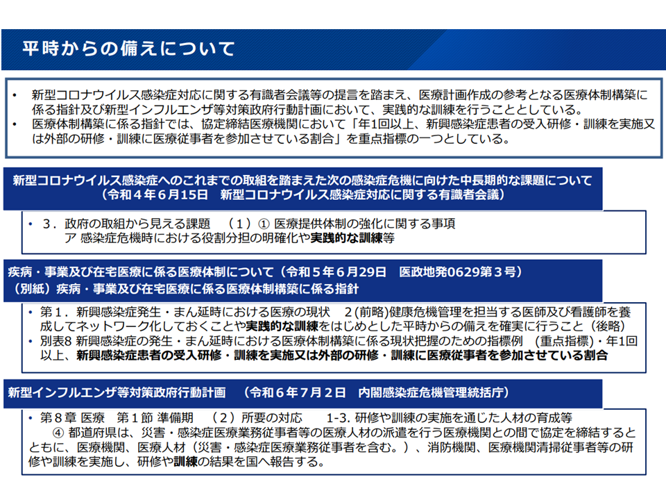 新興感染症に適切に対応できるよう、地域での訓練実施に向けた指針・ひな形を策定へ