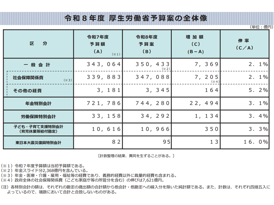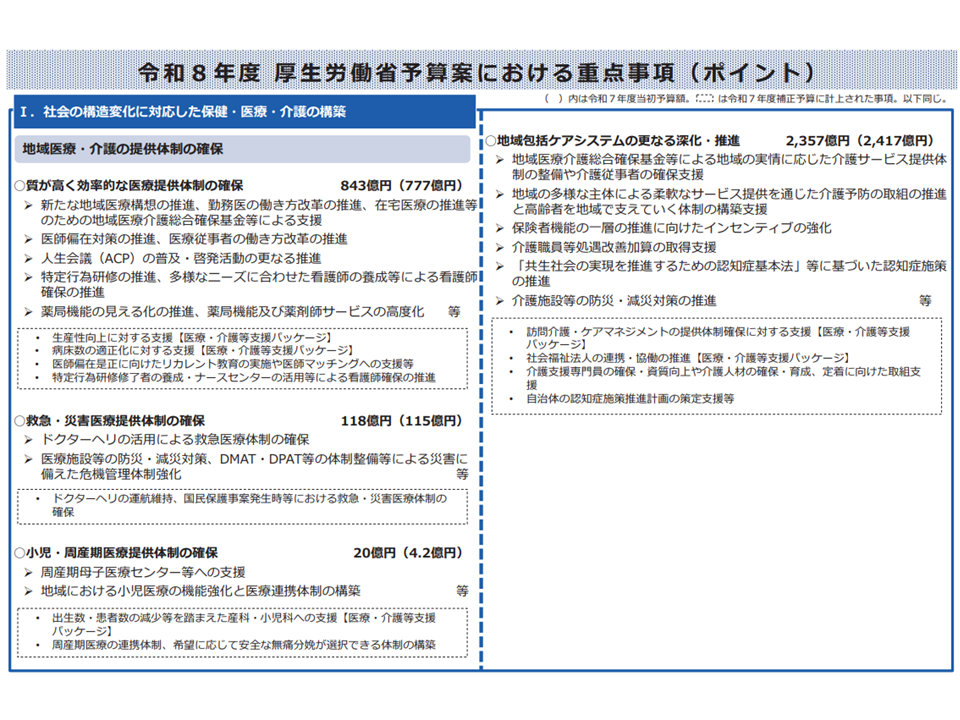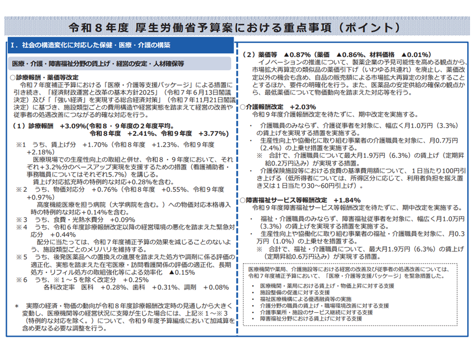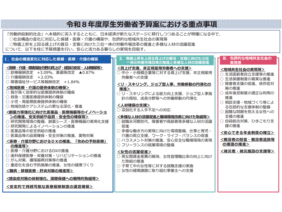 厚労省の来年度(2026年度)予算案の柱は、(1)社会の構造変化に対応した保健・医療・介護の構築(2)物価上昇を上回る賃上げの普及・定着に向けた三位一体の労働市場改革の推進と多様な人材の活躍促進(3)包摂的な地域共生社会の実現等—の3本です。