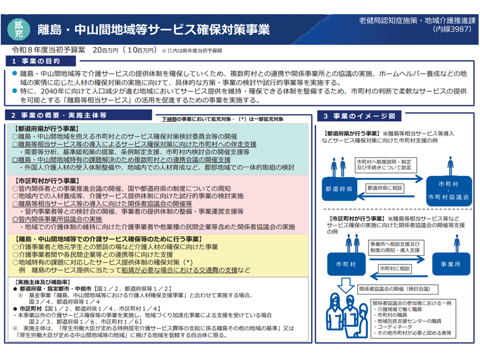 →離島・中山間地域等で介護サービス提供体制を確保しちえくため、複数町村との連携や関係事業所との協議の実施、ホームヘルパー養成などの地域の実情に応じた人材確保対策の実施に向けて、具体的な方策・事業の検討や思考的事業等を実施する(関連記事はこちら)