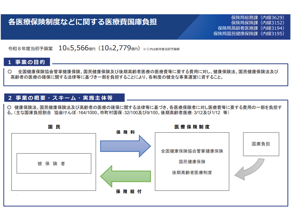 →健康保険法、国民健康保険法、高齢者医療確保法などに基づき、各医療保険者に対し医療費等に要する費用の一部を負担する(主な国庫負担割合は協会けんぽ:164/1000、市町村国保:32/100および9/100、後期高齢者医療:3/12および1/12など)