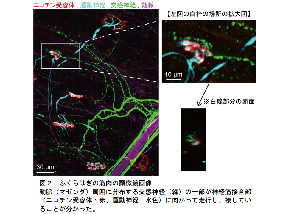 まず【構造面】では、ふくらはぎの筋肉における運動神経、アセチルコリン、交感神経、動脈をそれぞれ標識して顕微鏡で観察。その結果、「動脈に沿って走行する交感神経の一部が枝分かれし、神経筋接合部に接している」ことが確認できました。