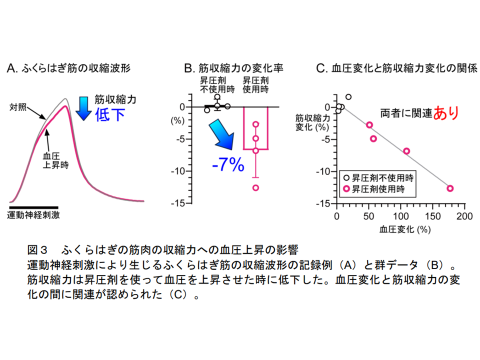 さらに交感神経活動の反射反応も、筋収縮力と同様に「血圧の上昇の程度に応じて弱まる」ことが分かりました。