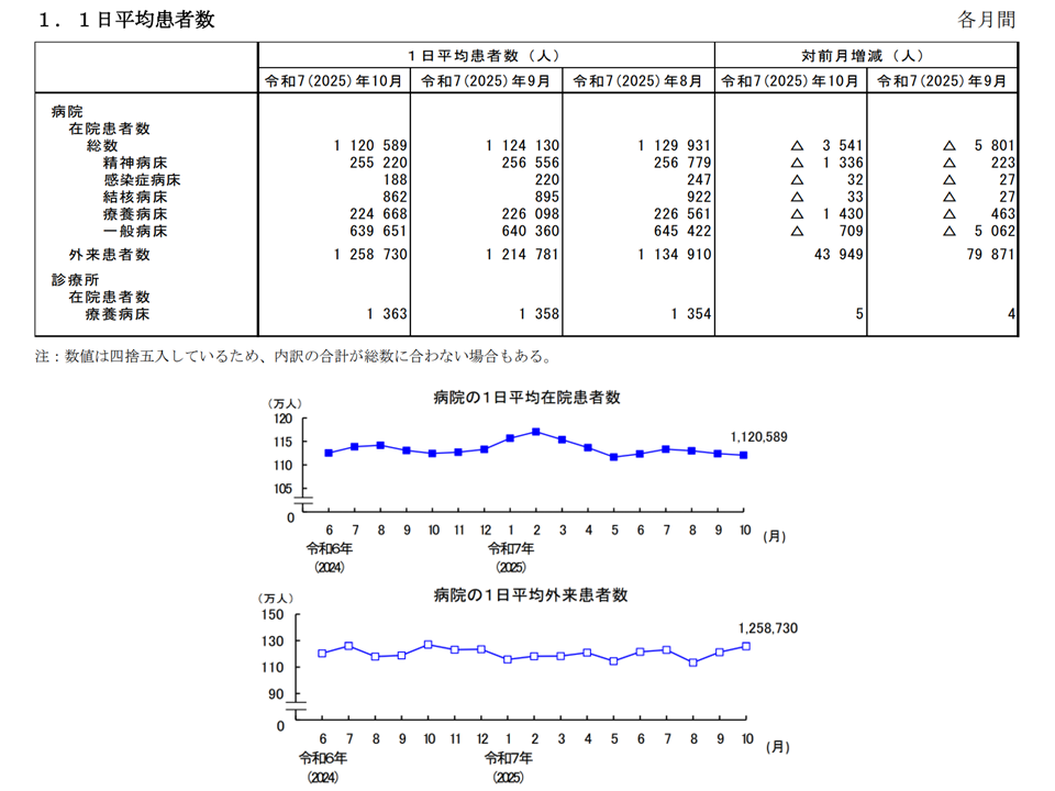 昨年(2025年)10月末における(1)「1日平均患者数」は、病院全体で▼入院:112万589人▼外来:125万8730人—となりました。