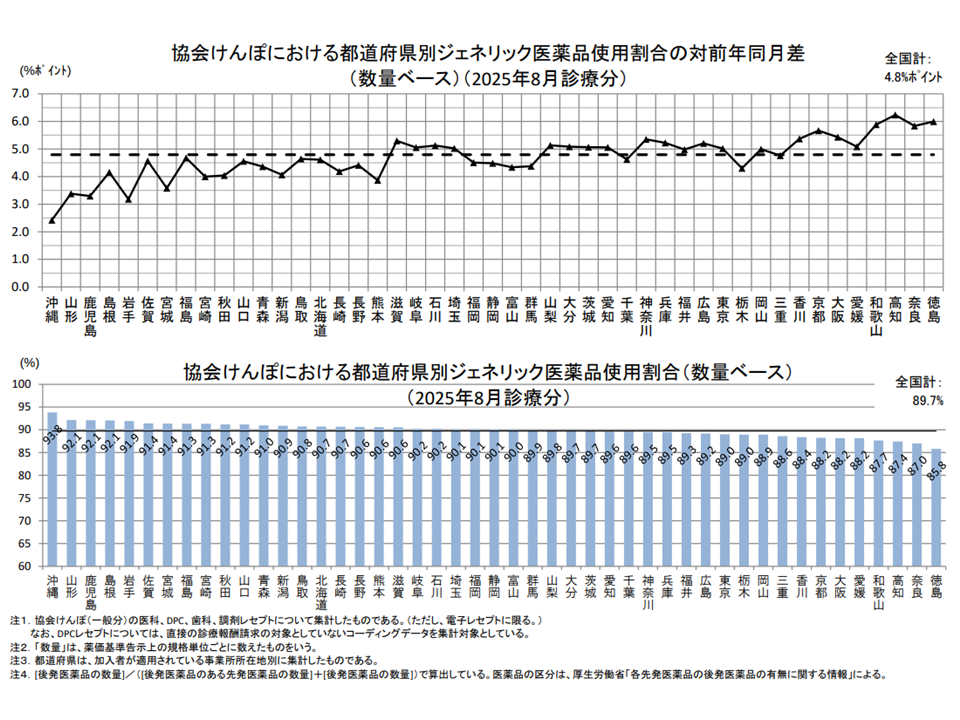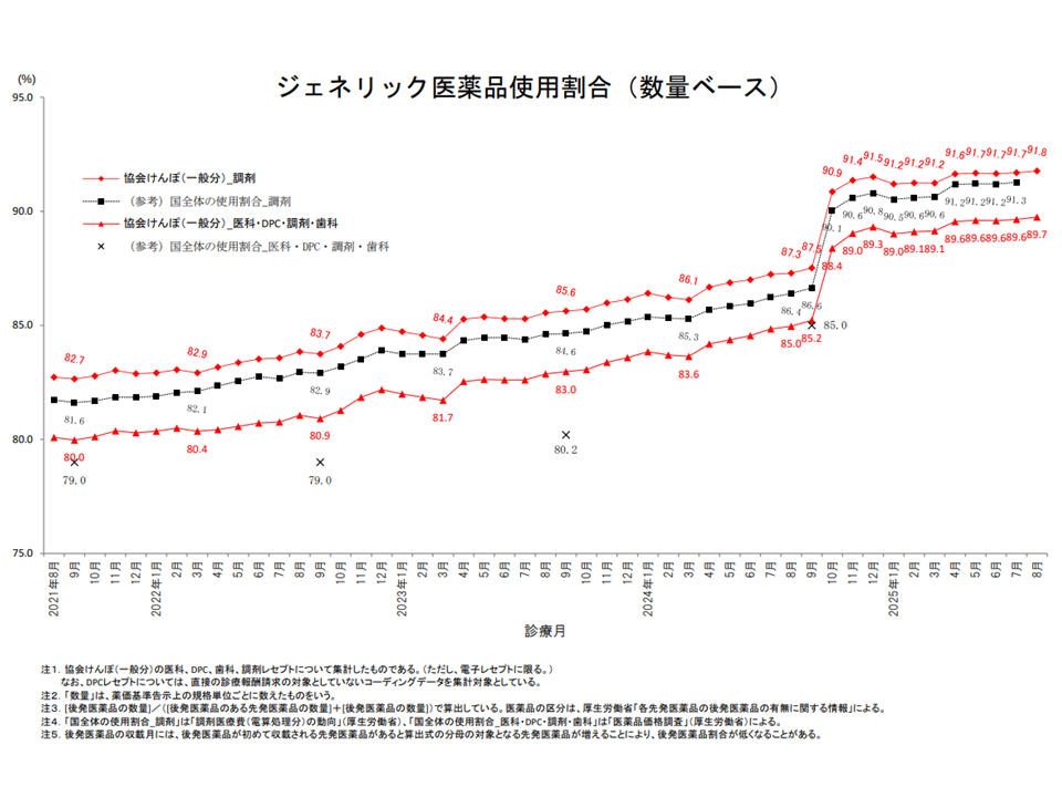 協会けんぽ全体の後発品割合、2025年8月にDPC等含めて89.7%・調剤分だけでは91.8%で、やはり「踊り場」に入っている