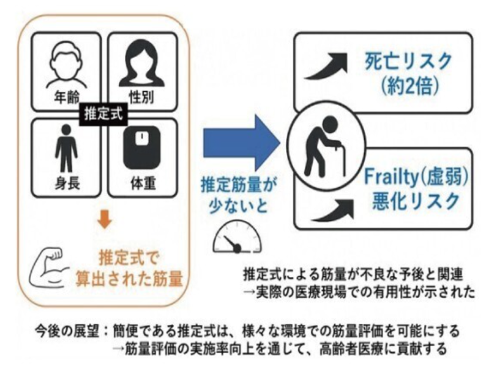 「年齢・性別・身長・体重等からの筋量推定」は簡便であり、患者に追加的な負担が生じないため、病院や地域での健診など様々な現場で広く活用できる。これにより「早期のフレイルやサルコペニアのリスク把握や予後予測」「リハビリテーション・栄養介入の計画立案」などに活用することが期待できる―。