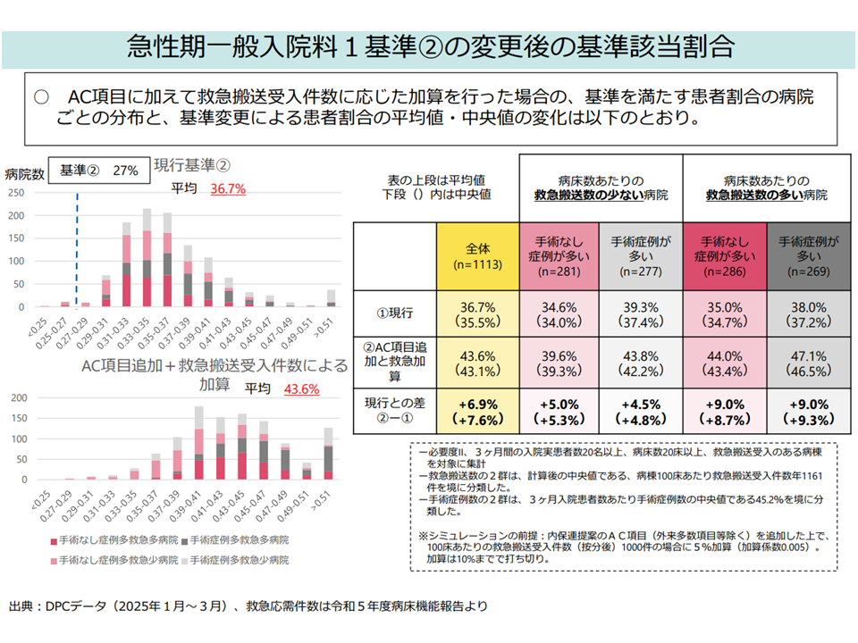 このほか、看護必要度の見直しに関して、▼今回(2026年度診療報酬改定)は時間も限られ、地域包括医療病棟の看護必要度該当者の定義を「A2点以上またはC1点以上」に見直すことでやむを得ないが、「内科疾患の多い高齢者救急を受け入れる」という機能に見合った適切な評価指標を検討していく必要がある(診療側の江澤委員)▼試算では救急搬送受け入れの多い病院の基準が非常に高く見積もられている。地方の人口規模の小さな地域にある急性期病院では、それほどの救急搬送は生じない点を考慮してほしい。救急搬送受け入れが多い病院で看護必要度が高く出るような見直しは良いが、地方の急性期病院の経営にも配慮をすべきである(診療側の小阪真二委員:全国自治体病院協議会副会長)—といった注文も付いています。