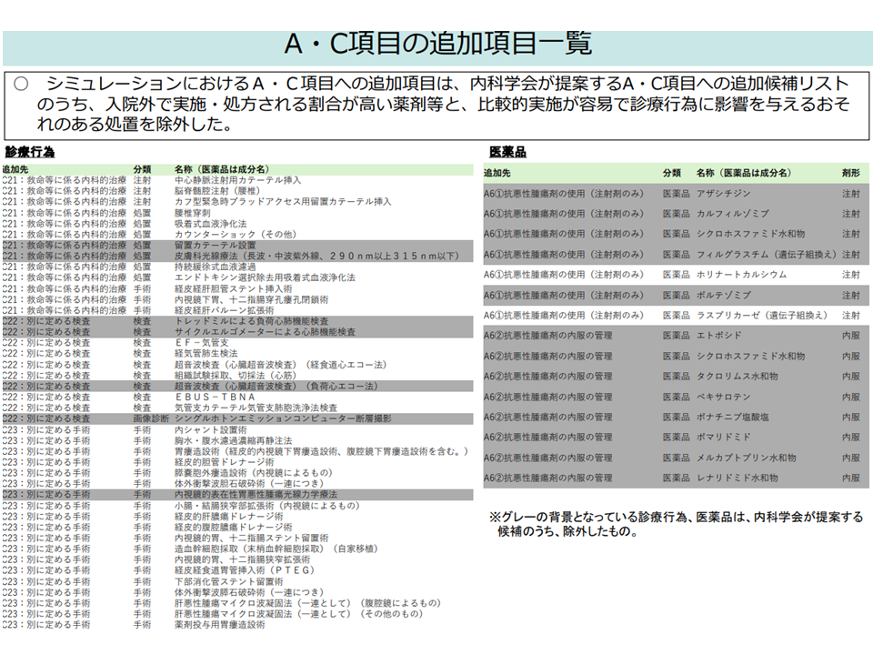 まず(1)のA項目(モニタリング・処置)・C(手術)の追加に関しては、日本内科学会の提案をベースに、「入院外で実施・処方される割合が高い薬剤等」「比較的実施が容易で診療行為に影響を与えるおそれのある処置」(下図表の灰色の網掛け部分)を除いたものを新たに盛り込んではどうかとの考えが示されました。