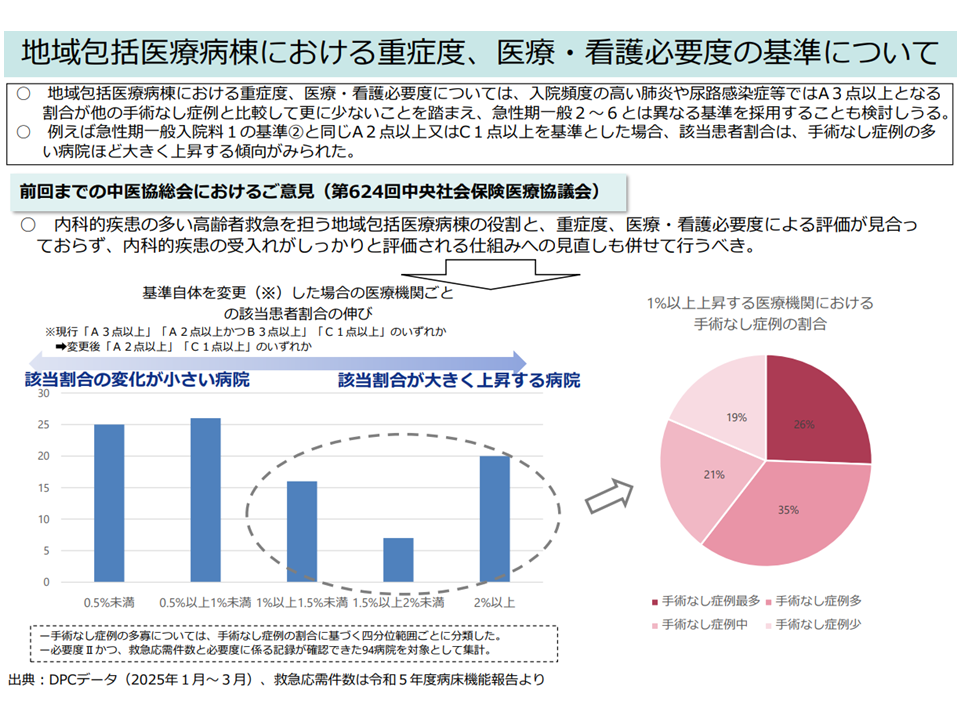 これに対し診療側の委員からは、▼病院経営は過去に例を見ない危機的な状況であり、看護必要度該当患者割合の基準値厳格化は慎むべきである。2026年度診療報酬改定は「病院経営を支える」改定とすべきである。また地域包括医療病棟の看護必要度についても、「高齢救急患者の受け入れ」という本体機能を踏まえて、基準値等を緩和し、届け出病棟・病院を増やすべきである(江澤和彦委員:日本医師会常任理事)▼看護必要度の見直しによる変動分(該当患者割合の増加分)を基準値に反映させることは論理的ではあるが、厳しい経営環境の中で地域医療提供体制を守る病院が対応しやすい基準値に設定すべきである(太田圭洋委員:日本医療法人協会副会長)—との反論が出ています。