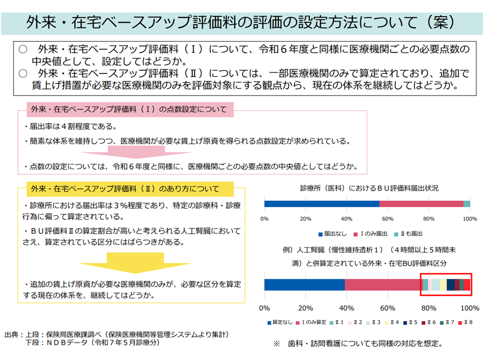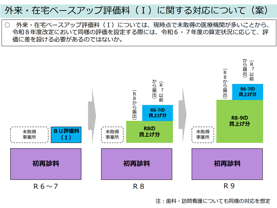 医療機関で働くスタッフの賃上げを強力に進めるために、例えば【外来・在宅ベースアップ評価料(I)】については、「2024年度・25年度の現行評価料」と「2026年度・27年度の新評価料」の2段構えで対応してはどうか―。