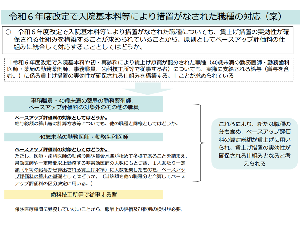 また、2024年度改定で「入院基本料等で措置することとされた職種」(40歳未満の勤務医・勤務歯科医、薬局の勤務薬剤師、事務職員、歯科技工所に勤務する歯科技工士など)についても、上述のように上野厚労相・片山財務相の折衝で「賃上げ措置の実効性が確保される仕組みを構築する」とされていることを踏まえて、「原則としてベースアップ評価料の仕組みに統合して対応する」考えを林医療課長は示しています。