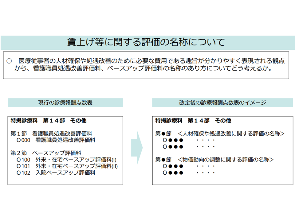 ▽「医療従事者の人材確保や処遇改善のために必要な費用である」趣旨が分かりやすく表現される観点から、看護職員処遇改善評価料、ベースアップ評価料の名称のあり方を検討してはどうか(診療報酬の体系的な整理も兼ねる、評価料の統合などは検討されていない)