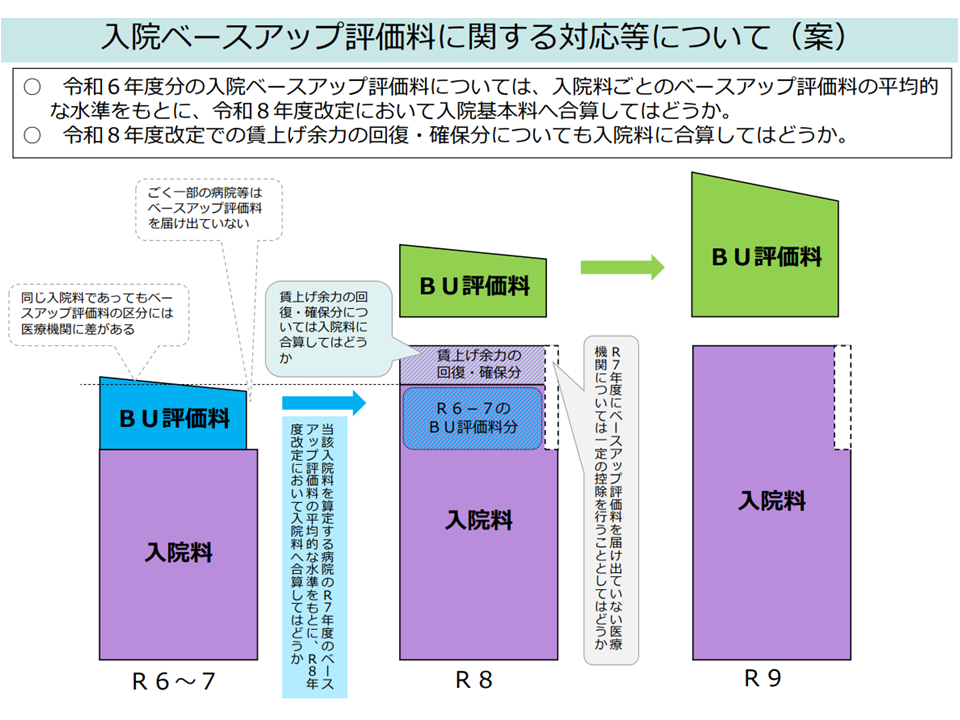 また入院については、現在の【入院ベースアップ評価料】(2024年度・25年度分)などを入院料に溶け込ませて「入院料を引き上げる」とともに、新たに2026年度・27年度分の【入院ベースアップ評価料】を設定してはどうか―。