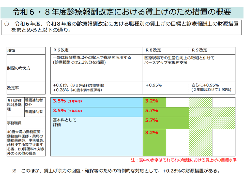 このため、2022年度の診療報酬改定では新型コロナウイルス感染症に積極的に対応する救急病院の看護職員の給与増を目指した【看護職員処遇改善評価料】が創設され、2024年度の診療報酬改定では、看護職員をはじめとする広範な医療従事者の給与増を目指した【ベースアップ評価料】の創設とともに、40歳未満の若手医師や事務職員の給与増を目指した「基本診療料(初・再診料や入院料など)の引き上げ」などが行われてきています。