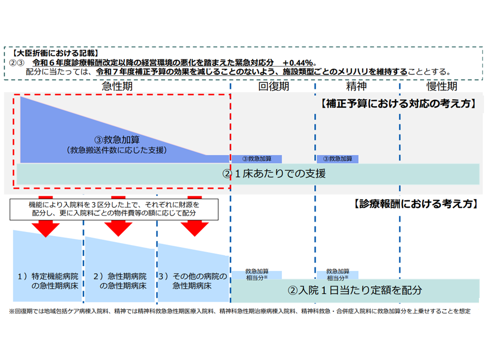また、上記(b)の「2024年度診療報酬改定以降の経営状況の悪化」に対する対応(入院料等の引き上げ)については、大臣折衝で2025年度補正予算の効果を減じることのないようにする」(維持する)とされた考え方を踏まえ、次のように対応する(入院料の引き上げを行う)方針が示されています(関連記事はこちら)。