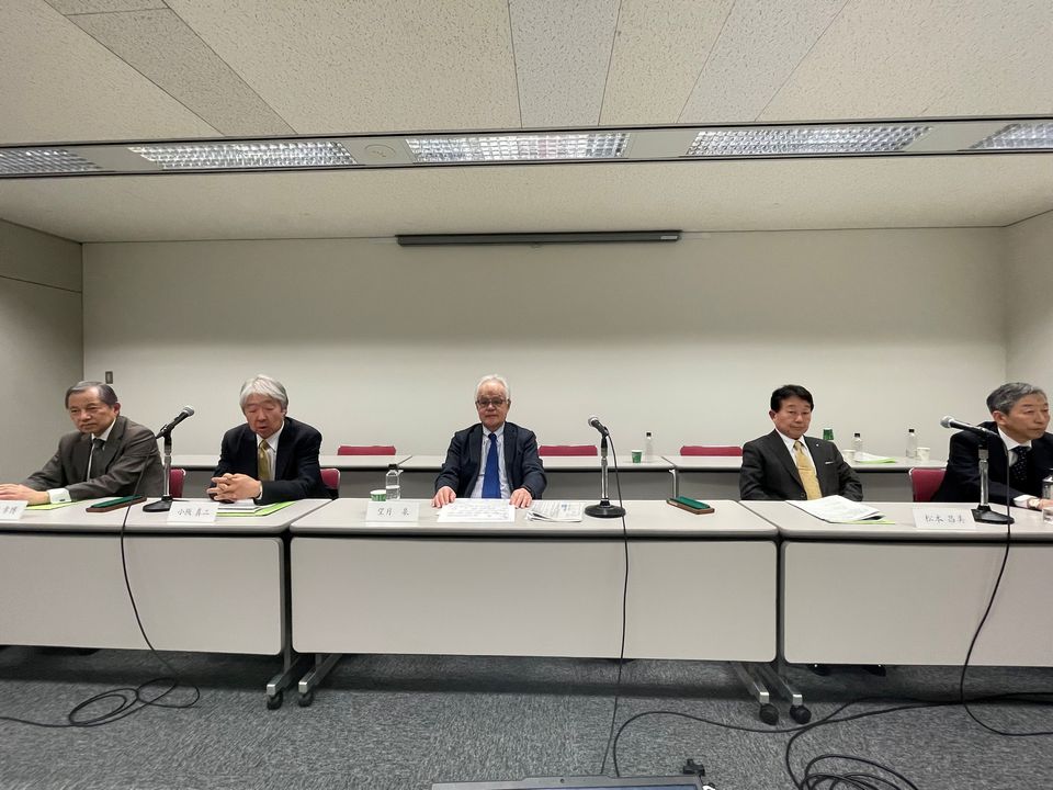 1月15日の定例記者会見に臨んだ全自病幹部。向かって左から野村幸博副会長(国保旭中央病院長)、小阪副会長、望月会長、松本昌美副会長(奈良県・南和広域医療企業団副企業長)、望月会長、田中一成参与(静岡県立病院機構理事長)