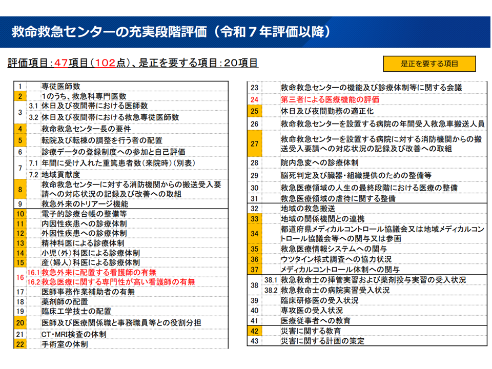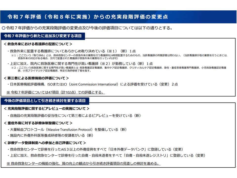 充実段階の評価は、(α)救命救急医療を行う体制が整っており、かつ重篤な救急搬送患者受け入れの実績が十分に上がっているか(β)是正すべき点はないか―という2軸で行われていますが、医療内容の変化等を踏まえた、次のような「項目の見直し」が行われます。