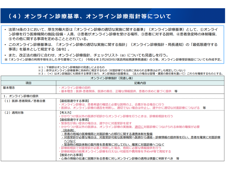 (4)は、上述した森光医政局長のコメントにあるように、現在、オンライン診療を行う際に遵守(保険診療はもちろん、自由診療でも)しなければならないオンライン診療指針について、▼「最低限遵守しなければならない事項」(オンライ ン診療を行う医療機関の施設/設備・人員、患者がオンライン診療を受ける場所、患者に対する説明、患者急変時の体制確保など)を【オンライン診断基準】という厚生労働省令に格上げし、違反等がある場合に厳格な対応を可能とする▼詳細を新たな「オンライン診療指針」に規定する―という形で改組するものです(下図表の「赤字」部分をオンライン診療基準に定め、厳格な運用を図っていく)。