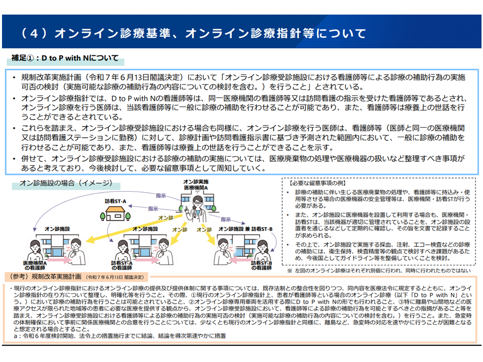 なお、「オンライン診療受診施設における診療の補助の実施」については、医療廃棄物の処理や医療機器の扱いなど整理すべき事項があるため、今後、検討を進めて「留意事項」として周知することになります。