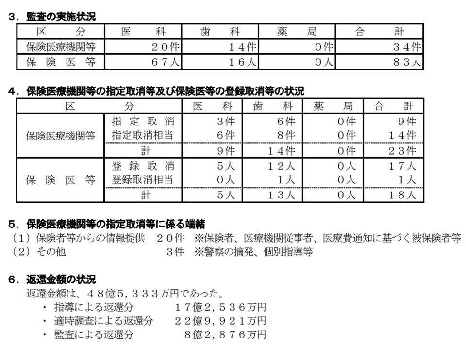 8億2876万円(前年度比7億5485万円・1021.3%増)、適時調査(医療機関等が施設基準等を守っているか確認する調査)による返還金額が22億9921万円(同8億9636億円・28.1%減)、指導による返還金額が17億2536万円(同3億7146万円・27.4%増)となっています。