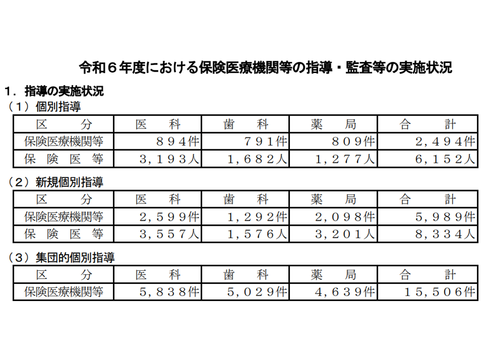 また、個別指導を受けた保険医等は6152人で、前年度から1727人・39.0%増加しています。内訳は、▼医師:3193人(前年度比419人・15.1%増)▼歯科医師:1682人(同692人・69.9%増)▼薬剤師:1227人(同566人・85.6%増)―となりました。