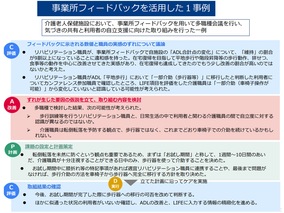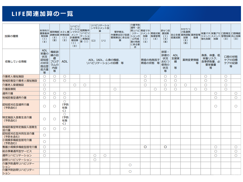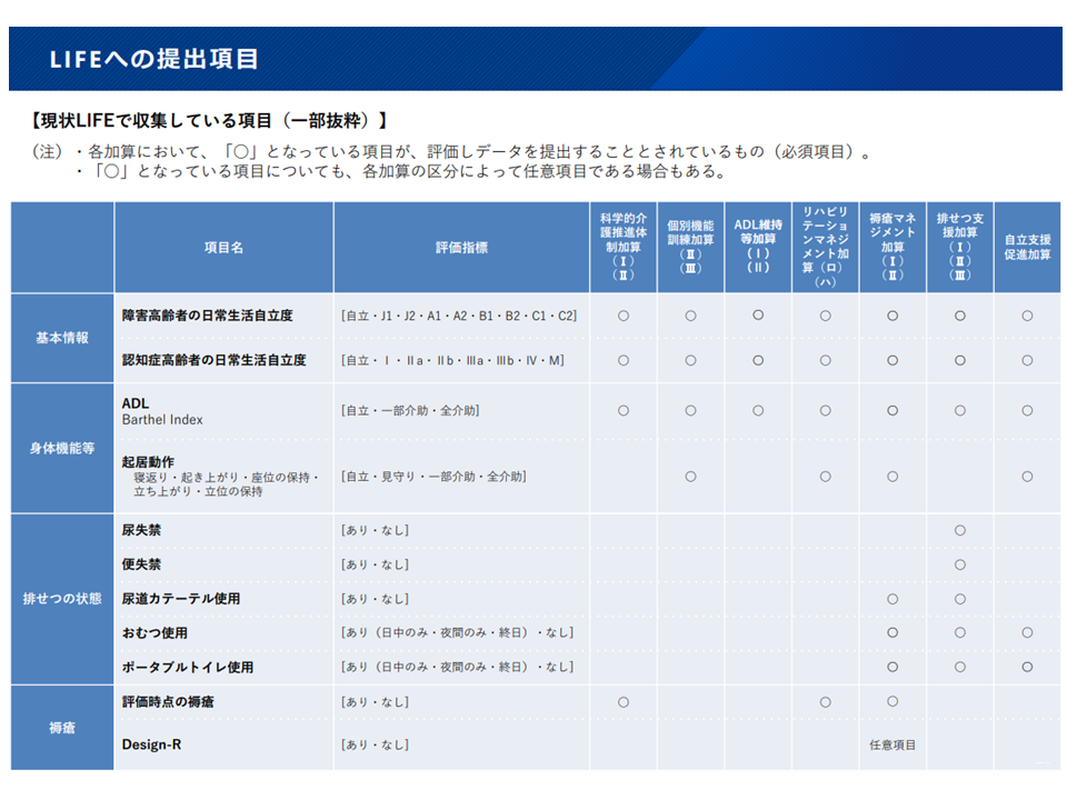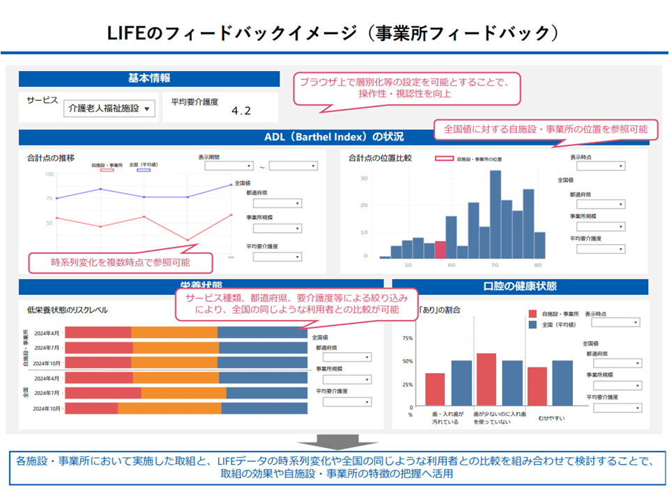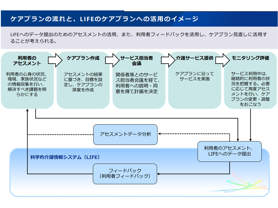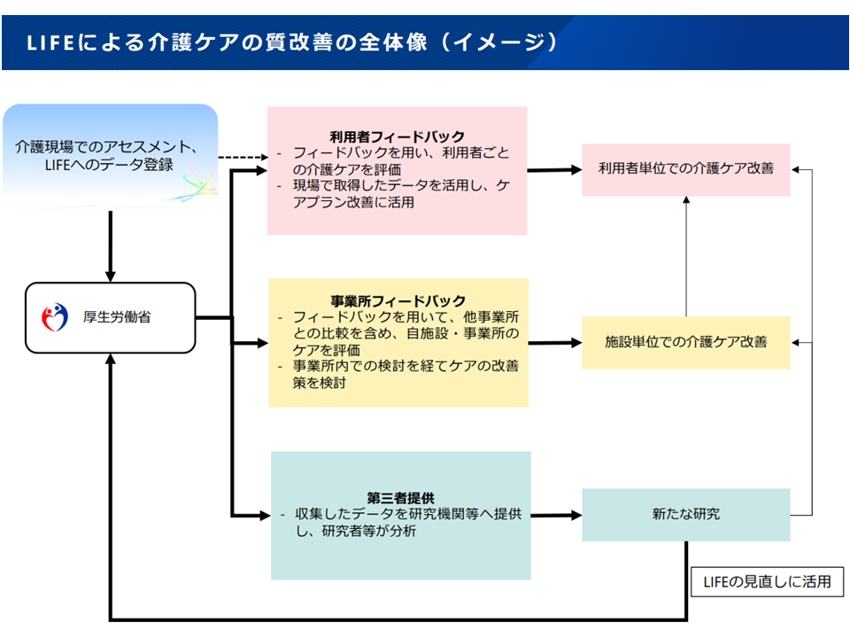 LIFE(介護関連データベース)に介護データを提出し、そこからフィードバックを受けることで「より質が高く、より効率的な介護サービス提供」を行うことが可能になると期待され、こうした取り組みに参加する介護事業所・施設は加算での経済的な評価が行われています。