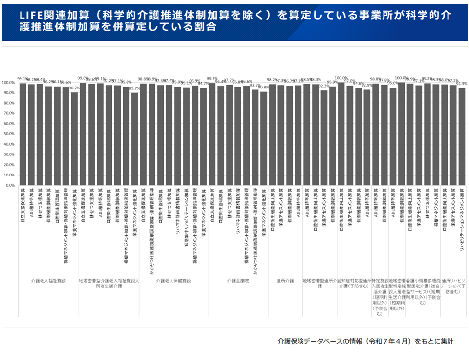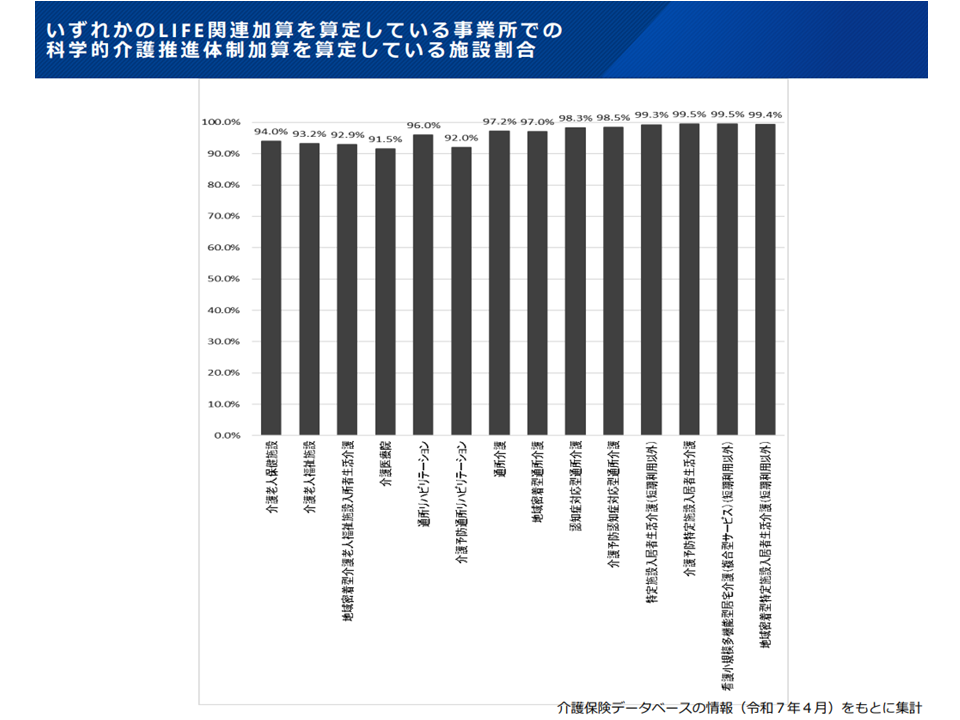 ただし、この見直しが行われた場合には「【科学的介護推進体制加算】を取得していなければ、他のLIFE関連加算を取得できない」ことになります。昨年(2025年)4月時点では最大10%程度の事業所・施設が「他のLIFE関連加算を取得しているが、【科学的介護推進体制加算】を取得していない」状況で、この見直しが行われた場合には、最大10%程度の事業所・施設が「これまで取得できていたLIFE関連加算を取得・算定できなくなる」ことを意味します。