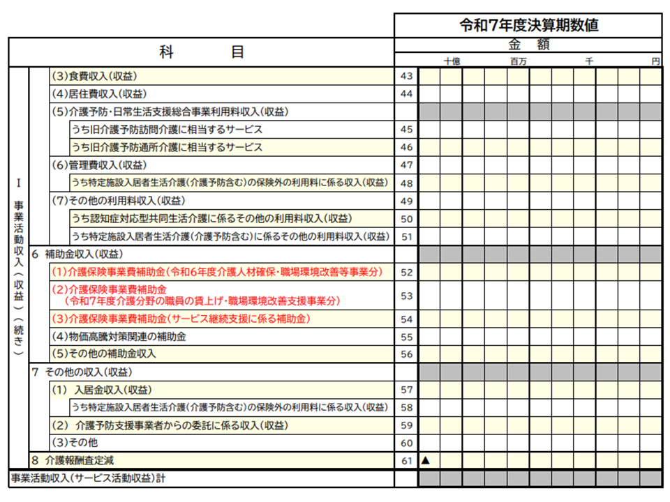 ▽介護従事者の賃金引き上げに係る補助金や介護サービスの継続支援に係る補助金の効果も踏まえた分析が行えるよう、それらの補助金収入の金額を記載する欄を追加する