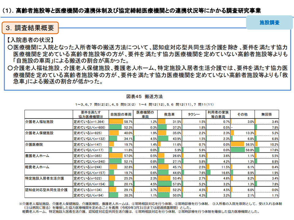 また、「協力医療機関を定めている高齢者施設等」のほうが、「協力医療機関を定めていない高齢者施設等」よりも 「自施設の車両」による搬送の割合が高い(救急車を要請しない)ことも明らかとなり、2024年度の介護報酬改定・診療報酬改定の効果が出ている状況を確認できます。