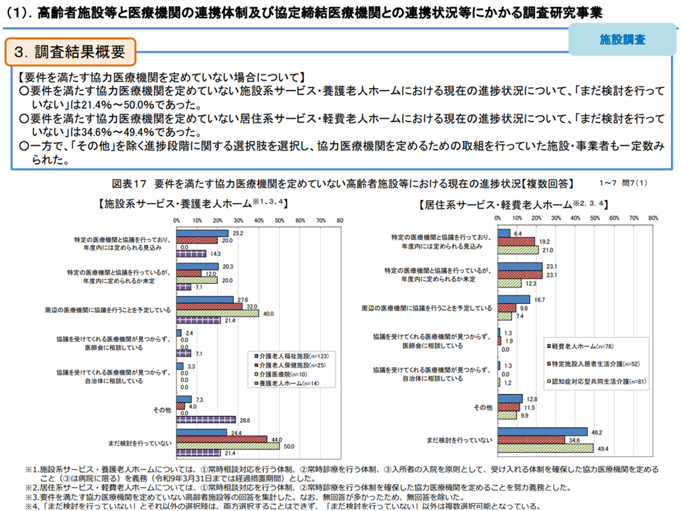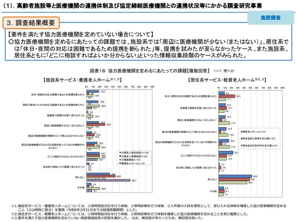 協力医療機関を定めていない理由を見ると、▼まだ検討を行っていない▼周辺の医療機関に協議を行うことを予定している―という少しのんびりしすぎている施設もある一方で、▼周辺に医療機関が少ない(またはない)▼休日・夜間の対応は困難であるため提携を断られた―ケースもあります。また、医療機関の理解不足(「入院を必ず受けなければならない」との誤解など)や定期的な会議の負担などから提携を断られるケースもあります。これらに関しては、自治体や医師会・病院団体などによる支援強化に期待が集まります。