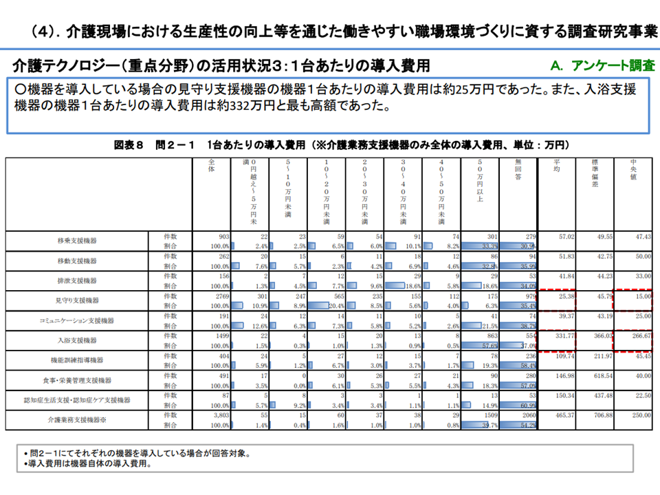 ▽見守り支援機器の1台あたり導入費用は約25万円、入浴支援機器の1台あたり導入費用は約332万円
