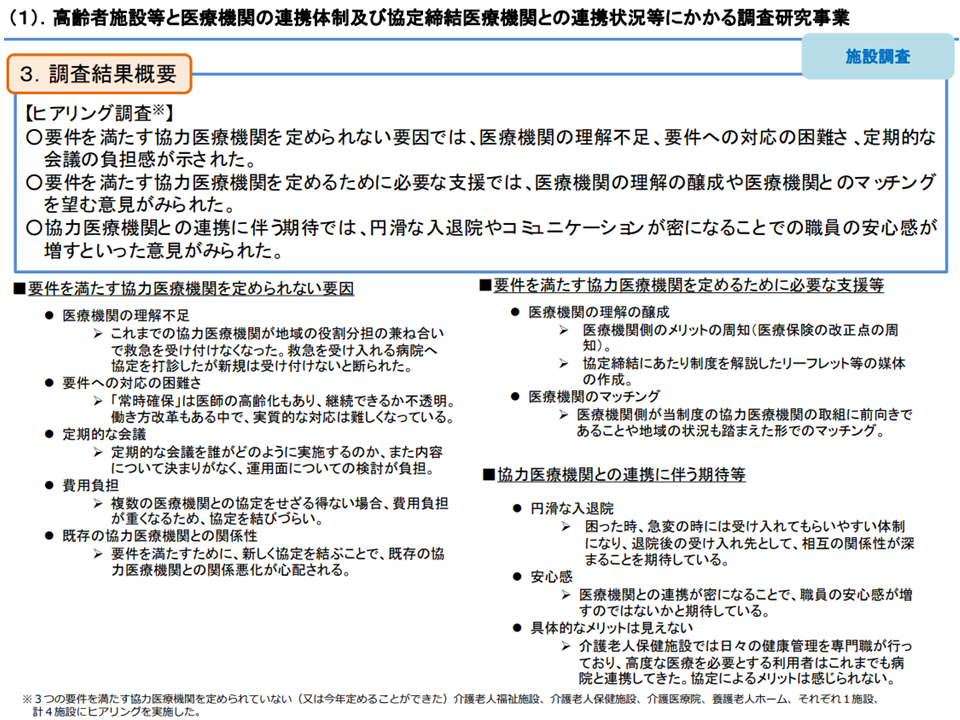 こうした調査結果を受けた議論では、▼施設長が医師等である場合には、協力医療機関を定めやすい(個人的なつながり)が、そうでない場合には「介護施設と医療機関とのマッチング」の仕組みなどを構築する必要がある。小規模施設では「自前の車両で患者を協力医療機関に運ぶ」ことが難しい点なども考慮する必要がある(小坂健委員:東北大学大学院歯学研究科研究科長)▼協力する医療機関側に対する、診療行為なども含めた詳細な調査も必要ではないか(松田晋哉委員長:福岡国際医療福祉大学ヘルスデータサイエンスセンター所長)—などの意見が出ています。