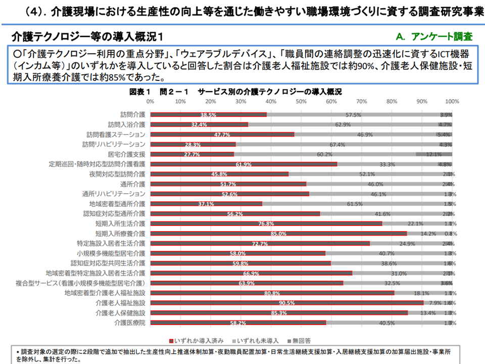 ▽「介護テクノロジー利用の重点分野」、「ウェアラブルデバイス」、「職員間の連絡調整の迅速化に資するICT機器(インカム等)」のいずれかを導入している割合は、サービスによるばらつきがあるが、介護老人福祉施設では約90%、介護老人保健施設・短期入所療養介護では約85%と高い